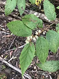 Seringia arborescens is an erect, spreading shrub that typically grows up to 2–4 m (6 ft 7 in – 13 ft 1 in) high and 2 m (6 ft 7 in) wide, but sometimes a small tree up to 8 m (26 ft). Its young branches are covered with rust-coloured, woolly hairs. The leaves are egg-shaped to lance-shaped, 50–150 mm (2.0–5.9 in) long and 15–60 mm (0.59–2.36 in) wide on a petiole 5–10 mm (0.20–0.39 in) long, with narrow stipules 2–4 mm (0.079–0.157 in) long at the base of the petiole. The upper surface of the leaves is more or less glabrous, the lower surface with raised veins and a dense covering of fine, star-shaped hairs. The flowers are cream-coloured or greenish-white, in cymes of 10 to 40 on a hairy peduncle 2–12 mm (0.079–0.472 in) long, each flower on a hairy pedicel 3–7 mm (0.12–0.28 in) long with bracts less than 5 mm (0.20 in) long, but that fall off as the flowers open. The sepal lobes are 3–5 mm (0.12–0.20 in) long, densely hairy on the back and more or less glabrous on the front. There are no petals but 5 tiny staminodes, and the anthers are yellow. Flowering occurs from June to October, and the fruit is a capsule, 5–10 mm (0.20–0.39 in) in diameter and covered with rust-coloured hairs.[2][3]
