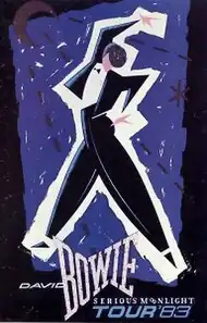 The Serious Moonlight Tour was a worldwide concert tour by the English musician David Bowie, launched in May 1983 in support of his album Let's Dance (1983). The tour opened at the Vorst Forest Nationaal, Brussels, on 18 May 1983 and ended in the Hong Kong Coliseum on 8 December 1983; 15 countries visited, 96 performances,[1] and over 2.6 million tickets sold.[2] It was the biggest tour of the year 1983.[3] The tour garnered mostly favourable reviews from the press.[4] It was, at the time, his longest, largest and most successful concert tour to date, although it has since been surpassed in length, attendance and gross revenue by subsequent Bowie tours.