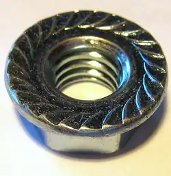 A serrated face nut is a locknut with ridges on the face of the nut that bite into the surface it is tightened against. The serrations are angled such that they keep the nut from rotating in the direction that would loosen the nut. Due to the serrations they cannot be used with a washer or on surfaces that cannot be scratched.[1] Sometimes both faces of the nut are serrated, permitting either side to lock.