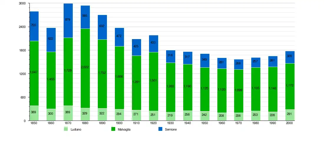 Serravalle has a population (as of December 2020) of 2,079.[9] As of 2015, 8.4% of the population are resident foreign nationals. Over the last 5 years (2010–2015) the population has changed at a rate of 4.17%. The birth rate in the municipality, in 2015, was 6.3, while the death rate was 10.6 per thousand residents.[8]