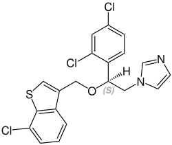 Sertaconazole contains a stereocenter and consists of two enantiomers. The pharmaceutical drug is a racemate, an equal mixture of the (R)- and (S)-forms.[3]