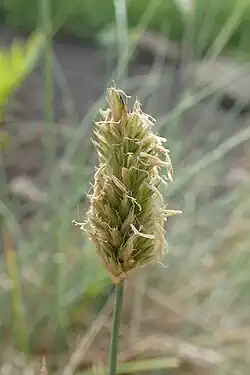 Sesleria argentea is a species of perennial grass in the family Poaceae. It is 35–55 centimetres (14–22 in) long with a 0.5–1 millimetre (0.020–0.039 in) long ciliolate membrane. Its leaves are either conduplicate or convolute, and are 10–20 centimetres (3.9–7.9 in) long and 3–5 millimetres (0.12–0.20 in) wide. It also has a linear panicle spiciform which is 3.5–5.5 centimetres (1.4–2.2 in) long and 0.5–0.7 centimetres (0.20–0.28 in) wide.[1]