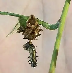 After shedding its skin, the pupa hardens and remains in a fairly rigid position. However the pupa can twist from side to side when disturbed. The pupae are variable in colour; being green, or creamy brown with small dark markings, or brownish and dark patterned. The pupa takes about ten days to mature and hatch into a butterfly.
