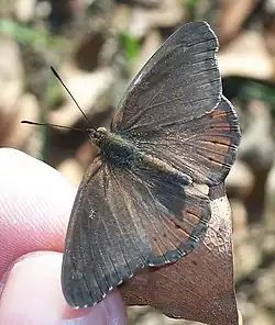 The wingspan of Boisduval's tree nymph is 40–45 mm.[2] The upper surface of the wings of the male are uniform dark brown, with small dark spots near the fringe of the hindwings. The female has an overall lighter brown colour on the upper surface, and orange-brown markings near the tips of the forewings. The dark spots near the fringe of the hindwings are more pronounced in females. The undersurface of the hindwings of both sexes are variegated grey and brown, and have an arc of seven dark spots encircled firstly by a greyish ring, and then an orange-brown ring. The undersurface of the forewing is orange brown with a row of four black spots near the tip. The female forewing also has two dark brown bands.
