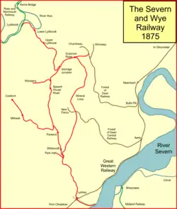 The Severn and Wye Railway and Canal Act 1872 (35 & 36 Vict. c. cxxiv) also authorised passenger operation on the line.[4] The S&WR was slow to implement this but in May 1875 stations were ready at Lydney Junction, Lydney Town, Whitecroft, Parkend, Speech House Road, Drybrook Road, and (possibly) Upper Lydbrook, and on the Coleford branch at Milkwall and Coleford. (Passenger excursions had previously been run, with the passengers conveyed in goods vehicles.)[9][1]