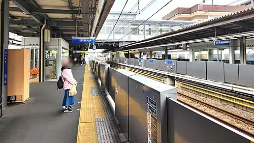 The station consists of two island platforms. The station building is elevated, and located above the platforms and tracks.