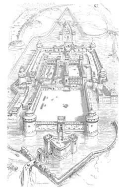 Under the Spanish domination which followed, the castle became a citadel, as the governor's seat was moved to the Ducal Palace (1535). Its garrison varied from 1,000 to 3,000 men, led by a Spanish castellan.[2] In 1550 works began to adapt the castle to modern fortification style, as a hexagonal (originally pentagonal) star fort, following the addition of 12 bastions. The external fortifications reached 3 km in length and covered an area of 25.9 hectares.[7] The castle also remained in use as a fort after the Spaniards were replaced by the Austrians in Lombardy.