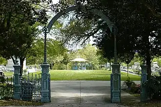 Sha'arai Shomayim Cemetery, also known as the Reformed Temple Jewish Cemetery, is a historic Jewish cemetery located in Mobile, Alabama, United States. It was established by Congregation Sha'arai Shomayim in 1876 after their previous cemetery, Jewish Rest in the adjacent Magnolia Cemetery, was filled to capacity.[2] The cemetery is situated on 15 acres (6.1 ha) and is surrounded by a 19th-century cast-iron fence and live oak trees. The entrance is through an ornamental arched gate inscribed with the congregation name in Hebrew letters.[3]