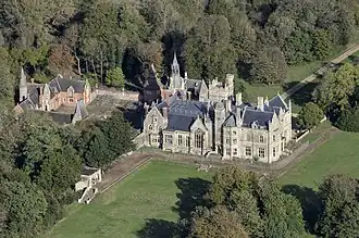 The result of Blore's, and then Teulon's, efforts, is decidedly vertiginous; Historic England notes the "balanced asymmetry and strikingly punctuated skyline".[22] The building is of three storeys on some fronts, and four on others, with a range of turrets and towers. Jill Franklin notes the diagonal staircase tower as one of the earliest examples of its type.[23] The building materials are Caen stone, brick and flint, with slate used for roofing.[22] The climax of the interior is Teulon's cruciform central hall, with stained glass, an organ and a timber roof with elaborate carving by Thomas Earp.[2] Mark Girouard, the architectural historian, considers Shadwell among Teulon's best work; "a dazzling display of Victorian fireworks, in its way a work of genius".[24]