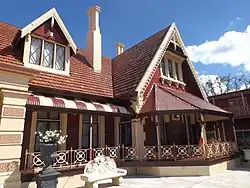 The style is Gothic-revival, with exterior decoration including: elaborate plaster mouldings to bargeboards; timber pendants in the gables; dormers; and quoining to the projecting front gables.[1]