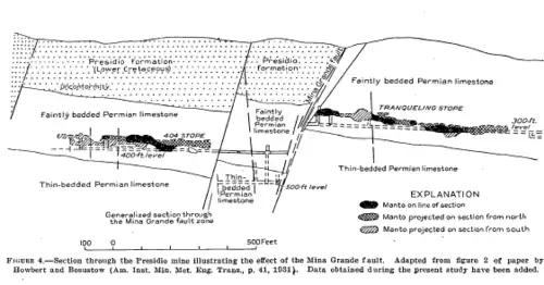 At the Presidio Mine, which started operation in 1880, the Permian Cibolo limestone formation is overlain unconformably by the Presidio formation, a massive dark-grey Cretaceous limestone. The Shafter limestone rests unconformably on the Presidio formation. Ore deposits are found in the Permian limestone and consist of supergene replacement minerals argentite and cerargyrite along the bedding. Veins and replacement mineralization are present in the overlying Cretaceous beds. Lodes in the Permian limestone include Manto ore deposits and thrust fault deposits, while those in the Cretaceous rocks are steep veins along normal faults. Smaller mines have operated in the district at various times, but the Presidio remains the largest and most continuous.[5]
