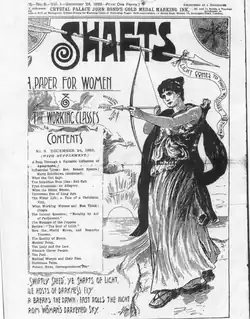 In an August 1893 editorial, Sibthorp stated that Shafts' purpose was to promote knowledge amongst women: "that women must first know all things, ere they can judge of an evil, or any proposed remedy for an evil".[12] Articles and editorials encouraged women to pursue "an education that might emancipate them from patriarchal assumptions".[13] Kate Flint notes in her book The Woman Reader, 1837–1914, that Shafts was one of few feminist periodicals at the time that promoted the furthering of women's rights through education in traditionally male-oriented domains, rather than through protection and control.[14]