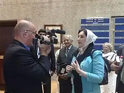 From Geneva, Bhutto proceeded to the United Kingdom, undergoing surgery on her mastoid before renting a flat in London's Barbican Estate.[103] There, she socialised with friends, going shopping, hosting dinner parties, and visiting the cinema.[104] One friend said that after her time in prison she remained in "a mildly traumatized state, jumping at sudden noise and worrying about who might be spying on her".[104] In March, Bhutto visited New York City and Washington D.C., where she met with media figures and middle-ranking government officials but was kept at bay by the administration of President Ronald Reagan.[105] Over the coming few years, Bhutto made several additional visits to the United States,[106] spoke to the European Parliament in Strasbourg,[107] visited the Soviet Union,[108] and undertook the Umrah pilgrimage to Mecca.[109]