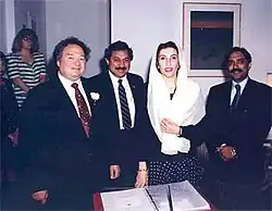 Back in Pakistan, she agreed to an arranged marriage; her mother selected Asif Ali Zardari as a suitable husband.[126] He was from a landowning family, and his father had obtained additional wealth through the construction and cinema industries.[127] The marriage ceremony took place in the Clifton Palace Gardens at Karachi in December 1987.[128] The event was billed as the "People's Wedding", serving as a de facto political rally,[129] with a subsequent party in a Lyari stadium being attended by 200,000 people.[130] There, some fired Kalashnikovs into the air in celebration, accidentally resulting in one death and multiple injuries.[131] Bhutto would have been aware that being married gave her an image of respectability which would improve her chances of being elected.[132] She kept the Bhutto family name rather than taking that of her new husband.[133] After the wedding, she soon became pregnant and gave birth to her first son, Bilawal.[134][135]