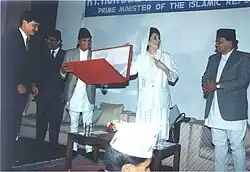 President Ghulam Ishaq Khan was constitutionally obliged to invite Bhutto to form the next government, but was reticent to do so. Under growing pressure—including from the U.S., a key ally—he reluctantly did so two weeks after the election.[160] To build her government, Bhutto formed a coalition with the Muttahida Qaumi Movement (MQM) party, which had 13 seats in parliament,[161] an action that upset the Sindhi nationalist faction within her party.[162] She was sworn in as the Prime Minister of Pakistan on 2 December 1988.[163] Bhutto became the first female prime minister in a Muslim-majority country,[164] as well as Pakistan's second nationally elected prime minister.[165] At 35 years old,[166] she was the youngest elected leader in the Islamic world,[167] the world's youngest prime minister,[168] and the youngest female prime minister ever elected.[169] After her election, party workers were encouraged to refer to her as Mohtarma ("respected lady").[170] There was hope among many observers that her premiership would mark a new era of multi-party democracy, growing gender equality, and better relations with India.[171] She personally stated that her electoral victory was "the tipping point in the debate raging in the Muslim world on the role of women in Islam".[172]