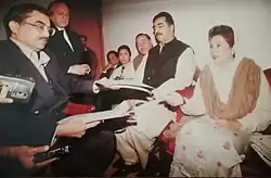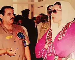Following her election, there remained significant mistrust between Bhutto and the right-wing military administration; many senior military figures viewed her, like her father, as a threat to their dominant role in Pakistan's political arena.[180] The country's three most powerful figures—the army chief Aslam Beg, the ISI chief Hamid Gul, and President Khan—all had contempt for her family.[181] This opposition was substantial and contributed to Bhutto's inability to pass any major legislation during her first term in office.[182] However, she had some successes with initiatives to encourage the development of civil society;[183] she ensured the release of a number of political prisoners detained under the Zia government.[184] and lifted the ban on trade unions and student associations.[185] She removed many of the constraints imposed on non-governmental organisations,[186] and introduced measures to lift the media censorship introduced by Zia's military administrations.[187] She entrusted Shamsul Hasan with dismantling the National Press Trust, a conglomerate of over 15 newspapers, but President Khan delayed signing the documents and thus the Trust would only be broken up during her second premiership.[188] A number of social reforms were carried out, such as the establishment of new literacy centres, new pension rights, and the abolition of admission and bed fees forced upon during the Zia regime.[189]