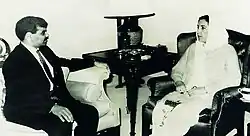In 1971, while she was at Harvard, Zulfikar invited her to join him in New York City, where he was involved in a United Nations Security Council meeting on that year's Indo-Pakistani War.[43] In December 1971, Zulfikar assumed the presidency of Pakistan, the first democratically elected leader after 13 years of military rule.[44] In 1972, Benazir accompanied her father to the India-Pakistan Summit in Simla as a replacement for her mother, who was ill.[45] There, she was introduced to the Indian prime minister Indira Gandhi.[46] While in Simla, she attracted much attention from both local and national Indian press,[20] the first time she received such notice.[47] She attributed this to the fact that—in her words—she "symbolized a new generation. I had never been an Indian. I had been born in independent Pakistan. I was free of the complexes and prejudices which had torn Indians and Pakistanis apart in the bloody trauma of partition."[48] In 1974, she flew to Lahore to accompany her father at the Organisation of Islamic Cooperation's summit. Here, she met a number of the assembled senior Muslim world leaders, who included Libya's Muammar Gaddafi, Egypt's Anwar Sadat, Syria's Hafez al-Assad, Saudi Arabia's Faisal, and Jordan's Hussein.[49]