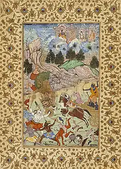 Shambara (Sanskrit: शम्बर, romanizedŚambara), also known as Shambarasura (Sanskrit: शम्बरासुर, romanizedŚambarāsur) is an asura featured in Hindu mythology. He abducted the infant Pradyumna, the son of Krishna and Rukmini, and attempted to drown him.[1] Pradyumna was raised by Mayavati (Rati), Shambarasura's cook, and the consort of the deity's true form of Kamadeva. After eventually growing up, Pradyumna killed Shambarasura and returned to his family in Dvaraka, along with his consort.