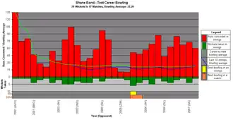 Bond currently has the second best bowling strike rate of all time in Test match cricket (amongst bowlers who have bowled a minimum of 2,500 deliveries), behind George Lohmann.[11]