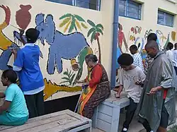 Lahiri was active in public art projects into her eighties. In 2010 she organised a project in Hyderabad, bringing together students from various schools, HIV-positive children, and differently abled children, to paint over the walls of the Lakshman Bagh temple as part of Rabindranath Tagore's 150th anniversary celebrations.[8] By 2010, 25 years after she first painted them, some of her public art and mural was still visible, including a 220 feet (67 m) length of wall on the Justice Chandra Madhav Road in Kolkata.[9]