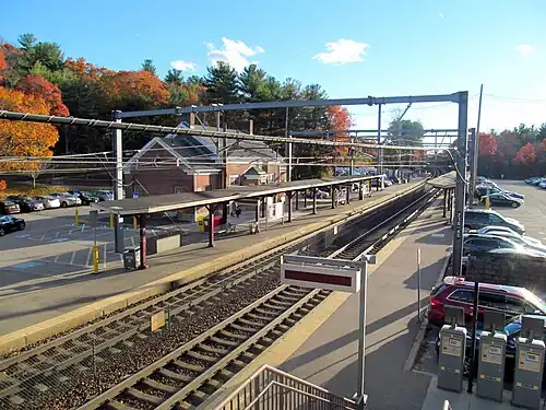 The project, which included adding mini-high platforms and improving handicapped access to the building, was originally expected to begin in the spring of 2013 and to be completed that fall at a cost of $1.2 million.[20] In May 2013, the MBTA issued a request for bids for the then-$2.6 million project, with work to start in August.[21][22] Notice to Proceed was given to the chosen contractor on September 5, 2013, with work to be completed by February 2014.[21] Noise testing begun in April 2014, followed by ongoing construction of mini-high platforms as well as improvements to the building and parking lot.[23] The accessible parking spots and the building retrofits were completed during May 2014.[1] The mini-high platforms were opened on September 30, 2014.[24]