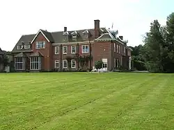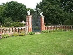 A feature of the house today is its grand approach. After climbing a short hill from the village of Newnham, a tree-lined avenue leads to a pair of heavy wrought iron gates designed in 1882 and supported by brick gate posts.[6] A brick 18th century gazebo (or possibly a faux gatehouse) watches over the entrance together with two stone bulls. A gravel stone driveway leads to the main, house flanked on the south by a walled terrace from the gazebo.