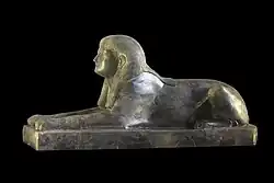 Due to Shatiqatu's absence from known ritual texts, for example offering lists, it has been suggested that she was not an object of active worship, but merely a literary character invented by Ugaritic scribes for the sake of a specific narrative.[9] However, it has also been proposed that statuettes of Shatiqatu could be prepared for potters to be used in healing rituals, with the procedure imitating the account of her creation in the Epic of Keret.[1] Additionally, Paolo Matthiae argues that she might correspond to the figure of a female sphinx which recurs on cylinder seals known from various sites located in modern Syria.[10] Said artistic motif reached this area in the early second millennium BCE, when one such a figure representing Ita, a daughter of Amenemhat II, was sent to Qatna.[11] Matthiae suggests that Shatiqatu was a similar non-anthropomorphic figure who can be interpreted as a Syrian adaptation of the Egyptian motif of the sphinx as a representation of "the pharaoh as protector of the great necropolis of Giza", reinterpreted as a supernatural defender of kingship in its new context.[12] However, according to Theodore J. Lewis Shatiqatu is described as anthropomorphic in the Ugaritic text she appears in.[13]