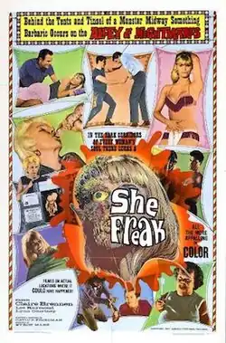 She Freak (sometimes stylized as She-Freak)[3] is a 1967 American exploitation horror film directed by Byron Mabe and starring Claire Brennen, Lee Raymond, and Lynn Courtney. It is an unofficial remake of the 1932 film Freaks.[2] An alternate version of the film, titled Asylum of the Insane, was also released, and features inserts shot by Donn Davison.