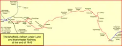 The Sheffield, Ashton-under-Lyne and Manchester Railway was an early British railway company which opened in stages between 1841 and 1845 between Sheffield and Manchester via Ashton-under-Lyne. The Peak District formed a formidable barrier, and the line's engineer constructed Woodhead Tunnel, over three miles (4.8 km) long. The company amalgamated with the Sheffield and Lincolnshire Junction Railway and Great Grimsby and Sheffield Junction Railway companies, together forming the Manchester, Sheffield and Lincolnshire Railway in 1847.[1]