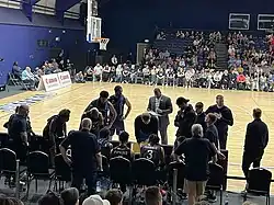 Sharks players and support staff during a time-out in a game against the Leicester Sharks in May 2024