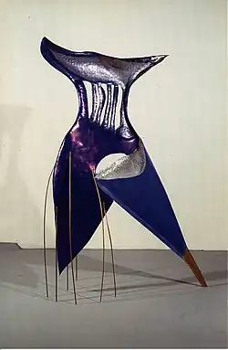 In the mid 1980s Cluett's work began to move away from linear forms to explore the influences of her travels in the Far East; they provided her with a new wealth of imagery and an intensified palette, lending greater freedom to her sculpture.[6] Colours gathered greater importance; applied to more expansive hammered metal surfaces, they cause the work to shine and glisten. Though travel research was an integral part of Cluett's working process, it had to be fitted around her commitments at Chelsea College of Art and Design, where she had become a Principal Lecturer and head of the MA Sculpture course.
