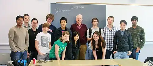 Sheldon Glashow was born on December 5, 1932, in New York City, to Jewish immigrants from Russia, Bella (née Rubin) and Lewis Gluchovsky, a plumber.[4] He graduated from Bronx High School of Science in 1950. Glashow was in the same graduating class as Steven Weinberg, whose own research, independent of Glashow's, would result in Glashow, Weinberg, and Abdus Salam sharing the 1979 Nobel Prize in Physics (see below).[5] Glashow received a Bachelor of Arts degree from Cornell University in 1954 and a PhD degree in physics from Harvard University in 1959 under Nobel-laureate physicist Julian Schwinger. Afterwards, Glashow became a NSF fellow at NORDITA and met Murray Gell-Mann, who convinced him to become a research fellow at the California Institute of Technology.[6] Glashow then became an assistant professor at Stanford University before joining the University of California, Berkeley where he was an associate professor from 1962 to 1966.[7][8] He joined the Harvard physics department as a professor in 1966, and was named Eugene Higgins Professor of Physics in 1979; he became emeritus in 2000. Glashow has been a visiting scientist at CERN, and professor at Aix-Marseille University, MIT, Brookhaven Laboratory, Texas A&M, the University of Houston, and Boston University.[5]
