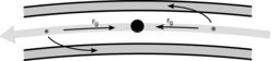 Operation of a shepherd moon– particles are located in front or behind the Moon in its orbit, so these are either accelerated in the direction of the moon and thrown to the outside, or they are slowed on their path and pulled inwards.