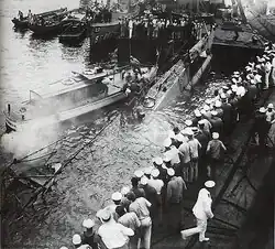 Divers worked to tunnel under the O-5’s bow so lifting cables could be attached. Ajax arrived about midnight, and by early morning, the cable tunnel had been dug, the cable run, and a lift was attempted. Sheppard J. Shreaves, supervisor of the Panama Canal’s salvage crew and himself a qualified diver, had been working continuously throughout the night to dig the tunnel, snake the cable under the submarine, and hook it to Ajax’s hoist. Now the lift began. As the crane took a strain, the lift cables broke. Shreaves and his crew worked another cable set under the bow and again Ajax pulled. Again, the cable broke. All through the day, the men worked. Shreaves had been in his diving suit nearly 24 hours. As midnight on the 29th approached, the crane was ready for another lift, this time with buoyancy being added by blowing water out of the flooded Engine Room. Then, just after noontime, the bow of O-5 (SS-66) broke the surface. Men from the salvage force quickly opened the torpedo room hatch, and Breault and Brown emerged into the fresh air.[3]