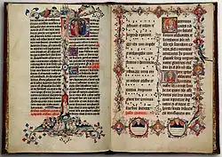 The Sherborne Missal (London, British Library, Add MS 74236) is an early 15th-century English illuminated manuscript missal, one of the finest English examples of International Gothic painting. With 347 vellum leaves measuring 535 by 380 millimetres (21.1 in × 15.0 in), it weighs 20 kg.[1] It has survived in excellent condition,[2] and is usually on display at the Ritblat Gallery in the British Library. It has been described as "beyond question the most spectacular service book of English execution to have come down to us from the later Middle Ages."[3]