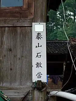Shigandang (simplified Chinese: 石敢当; traditional Chinese: 石敢當; pinyin: shí gǎn dāng; Wade–Giles: shih-kan-tang; Japanese: 石敢當, romanized: ishigantō) is an ornamental stone tablet with writing,[1] which is used to exorcise evil spirits in east Asia. 石敢當 are often associated with Mount Tai, and are often placed on street intersections or three-way junctions, especially in the crossing, which is often considered a spiritually dangerous place (凶位).