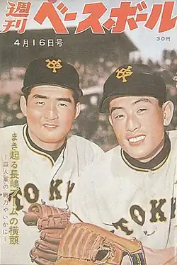 Nagashima played perhaps his most well-known game on June 25, 1959, when the Japanese emperor Hirohito attended a baseball game for the first time.[15] Nagashima hit the game-winning home run off Minoru Murayama, and rookie Sadaharu Oh also had a home run in the game.[15][16] The Yomiuri Giants cleanup consisting of Oh batting third, and Nagashima batting fourth, were nicknamed the "ON Hou" (translated to: "Oh-Nagashima Cannon") as Nagashima continued his hitting prowess, and Oh emerged as the best hitter in the league.[9][17] The Giants won the league championship nine years in a row from 1965 to 1973, and Oh and Nagashima dominated the batting titles during this period.[18] Nagashima won the season MVP award five times, and the Best Nine Award every single year of his career (a total 17 times).[18][19] As a result of his dominant performances with the Giants, he was nicknamed "Mr. Pro Baseball" of Japan and "Mr. Giants".[20][21]