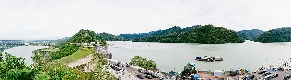 Shihmen Dam (Chinese: 石門水庫; lit. 'Stone Gate Dam'; also spelled Shimen or Shihman) is a major rock fill dam across the Dahan River in northern Taoyuan City. It forms the Shihmen Reservoir (石門水庫), Taiwan's third largest reservoir or artificial lake. It provides irrigation in Taoyuan, flood control for the Taipei Basin, and hydroelectricity and domestic water supply for more than three million people in northern Taiwan.