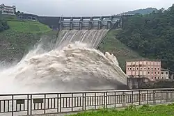 Shihmen is one of several key reservoirs in the Tamsui River system used to cut peak flood flows during typhoon events. Dam releases are coordinated with those from Feitsui Dam to the east in order to reduce the severity of flooding.[24] However, sediment accumulation in the reservoir has reduced its effectiveness on large flooding events. As a result, the "frequency with which the Shih-men Dam discharges water down its spillway ranks first among Taiwan's reservoirs. The phrase 'the Shihmen Reservoir is releasing flood water' has become a euphemism for 'your fly is open'."[25] Additionally, large flooding events can cause turbidity levels in the reservoir to increase by over 3,000 times of average, forcing authorities to shut down water supplies.[26] This problem has been exacerbated by the increasing percentage of Shihmen water going to residential and industrial users, who generally demand clearer water than the agricultural users Shihmen was originally intended to supply.[27]