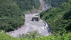 A number of measures have been taken to try and reduce the amount of sediment flowing into Shihmen Reservoir. Because of the construction of hundreds of sediment-trapping dams or sabo dams, the upper reaches of the Dahan and its tributaries are now among the most heavily impounded river systems in Taiwan, with at least 123 such dams along the main stem alone.[25] The largest 24 sabo dams have collectively prevented some 36 million cubic metres (29,200 acre feet) of sediment from reaching Shihmen Reservoir.[34] Only one, the Junghua Dam, is still collecting sediment, although its 16 million cubic metre (13,000 acre foot) capacity is nearly full.[13] These sediment catching dams have also failed on several occasions causing even more debris and silt to wash into Shihmen. Among these was the failure of Baling Dam during Typhoon Wipha (2007), which caused 10 million cubic metres (8,000 acre feet) of sediment to wash downstream, destroying the village of Baling.[35] Dredging efforts on Shihmen Reservoir have also been only partly successful. Beginning in 1985, seven dredging companies removed more than 10 million cubic metres (8,000 acre feet), but the reservoir continued filling with sediment faster than it could be excavated. The capacity of the silt disposal areas was exhausted in 1995.[25] Other measures taken to decrease sediment flow include the construction of retaining walls and the reforestation of clear-cut areas.