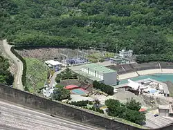 The dam's hydroelectric power station is located on the left bank of the Dahan River at the base of the dam. Two steel 4.57-metre (15.0 ft) diameter penstocks, each 318.8 metres (1,046 ft) long, feed water to two Francis turbines. The maximum water flow through the power plant is 137.2 cubic metres per second (4,850 cu ft/s).[20] Each generator has a capacity of 45,000 kilowatts (KW), for a total capacity of 90,000 KW.[3] The plant produces about 200 million kilowatt hours per year.[4]