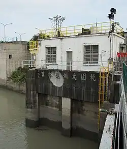 The Shihmen afterbay reservoir, located below the main dam, regulates the water release into the Dahan River and provides the intake point for the Taoyuan and Shihmen Canals. The afterbay is formed by a 317.5-metre (1,042 ft) long weir and can store up to 2,200,000 cubic metres (1,800 acre⋅ft). The headworks for the Taoyuan Canal have a capacity of 18.6 cubic metres per second (660 cu ft/s), and the Shihmen Canal can carry up to 18.4 cubic metres per second (650 cu ft/s).[19]