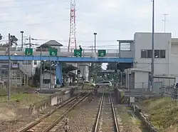 The station has one side platform and one island platform, connected to the station building by both a level crossing and a footbridge. The station is staffed.