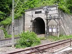 Shin-shimizu Tunnel (新清水トンネル, Shin-shimizu tonneru) is one way tunnel towards Niigata on JR's Joetsu Line located between Yuzawa town in Niigata Prefecture and Minakami town in Gunma Prefecture in parallel to other one-way Shimizu Tunnel (towards Tokyo) with total length of 13.5 km (8.4 mi). It was built and completed in 1967 under Mount Tanigawa that has 3 railway-tunnels: single-tract Shin-shimizu & Shimizu tunnels for Joetsu Line, and double-tracts Daishimizu Tunnel for Joetsu Shinkansen line.[1][2][3][4] A distinctive station known as Doai Station features a platform situated within an underground tunnel, specifically positioned within the middle of the Shin-Shimizu Tunnel.[5]