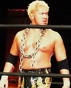 Makabe teamed with GBH allies Yano and Ishii on January 4, 2007, at Wrestle Kingdom in Tokyo Dome, defeating Travis Tomko and AJPW's D'Lo Brown and Buchanan.[40] Four days later, Makabe retained the WEW title against Tetsuhiro Kuroda at an event co-produced by Apache Pro and Takashi Sasaki;[41] he would defend the championship for a third time on February 4, 2007 at LOCK UP's first show in Korakuen Hall, defeating Mammoth Sasaki in a cage death match.[42] On February 18, 2007, Makabe faced and lost to Shinsuke Nakamura in a match pitting GBH against Nakamura and Masahiro Chono's BLACK faction, subtitled "SANCTIONS".[43] Makabe again entered the New Japan Cup in March 2007, making it to the finals with victories over Travis Tomko and Takashi Iizuka by pinfall and Hiroyoshi Tenzan by disqualification, before losing to Yuji Nagata in the final.[44] On April 8, 2007, Makabe faced Nakamura in a rematch of their February contest, defeating Shinsuke in a chain death match.[45] Makabe made his fourth defense of the WEW title on April 15, 2007 in Apache Pro, again defeating Mammoth Sasaki.[41] Makabe battled Nakamura for a third time on May 3, 2007 in a match dubbed "Reality or Revenge", winning once more.[46]