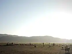 The Shiraki Plain is sometimes divided into the northern Greater Shiraki (დიდი შირაქის ვაკე, didi shirak'is vake) and southern Lesser Shiraki (პატარა შირაქის ვაკე, patara shirak'is vake), separated by a low, steep ridge. Geographically, the plain falls within the boundaries of the Dedoplistsqaro Municipality in Georgia's easternmost region of Kakheti and adjoins the Vashlovani National Park. While the park is administered by the Dedoplistsqaro Municipality, the Shiraki's largest portion is under the jurisdiction of the Akhmeta Municipality, not contiguous with the Shiraki plain and located further north in Kakheti. This situation reflects the fact that the Shiraki steppe has been used, since the 17th century,[3] as winter pastures by shepherds from Akhmeta's Tush community, traditionally engaged in transhumant lifestyle of sheep farming. Residential infrastructure is largely absent on the pastures. There are only livestock farms.[4] The whole distance from the areas of the Tush summertime residence to the Shiraki winter pastures is about 200 kilometres (120 mi) and involves crossing of Georgia's highest pass, the Abano, at 2,960 metres (9,710 ft) above sea level.[5]