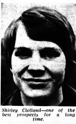 She later specialized in the women's pentathlon and was a member of the Leicester Coritanian Athletics Club.[3] Clelland set a long jump record at the Leicestershire County Championships that would last over 10 years, jumping farther than 5.80 m.[12] At the 1969 and 1970 Midlands Women's Amateur Athletic Association Championships (WAAA), Clelland won the pentathlon silver medal, only finishing behind Olympian Sue Scott in 1970.[13][3]