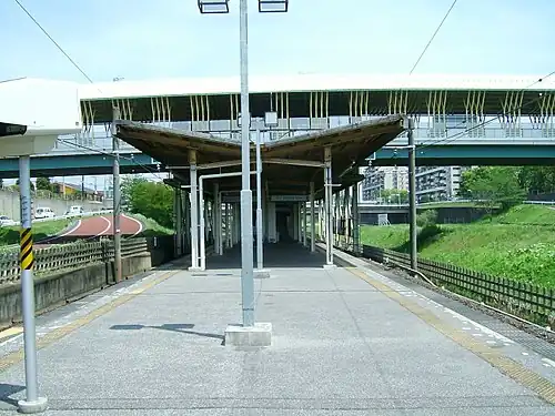 This station consists of a single ground-level island platform serving two tracks, with the station building built above.