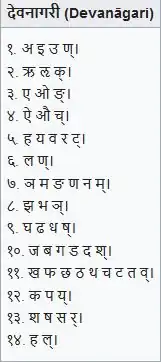 The Śiva·sūtras, technically akṣara·samāmnāya, variously called māheśvarāṇi sūtrāṇi, pratyāhāra·sūtrāṇi, varṇa·samāmnāya, etc., refer to a set of fourteen aphorisms devised as an arrangement of the sounds of Sanskrit for the purposes of grammatical exposition as carried out by the grammarian Pāṇini in the Aṣṭādhyāyī.[1][2]