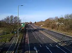 This latter section, from the Pepper Hill Interchange (near Northfleet and the Ebbsfleet International railway station), to the Cobham Interchange underwent extensive works (2007–2009) to move the entire carriageway south to run parallel to the Channel Tunnel Rail Link, so as to move the road away from residential housing – and continue using four lanes in each direction, with grade separated junctions.